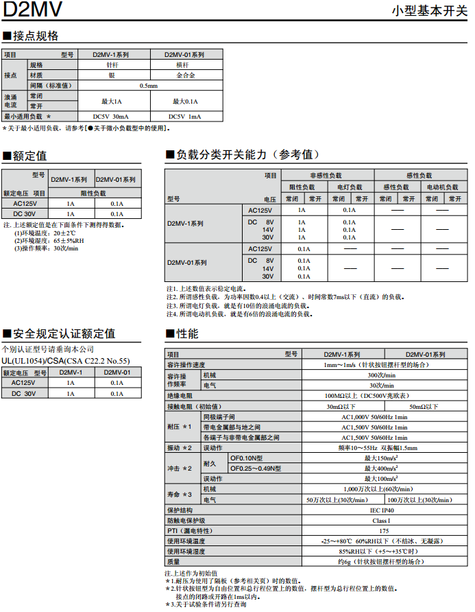 歐姆龍微動開關(guān)D2MV系列產(chǎn)品參數(shù):