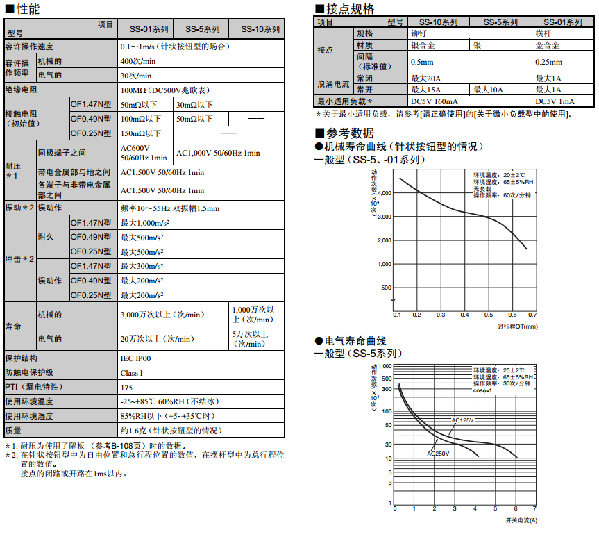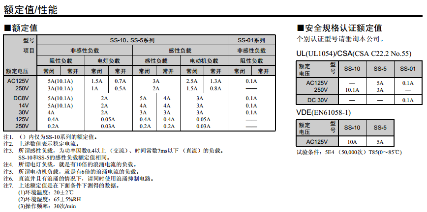 歐姆龍微動(dòng)開關(guān)SS系列產(chǎn)品額定值/性能: